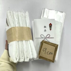 写真はタオルを折り、熨斗を入れて最後に5束づつ茶帯で包んだものです。